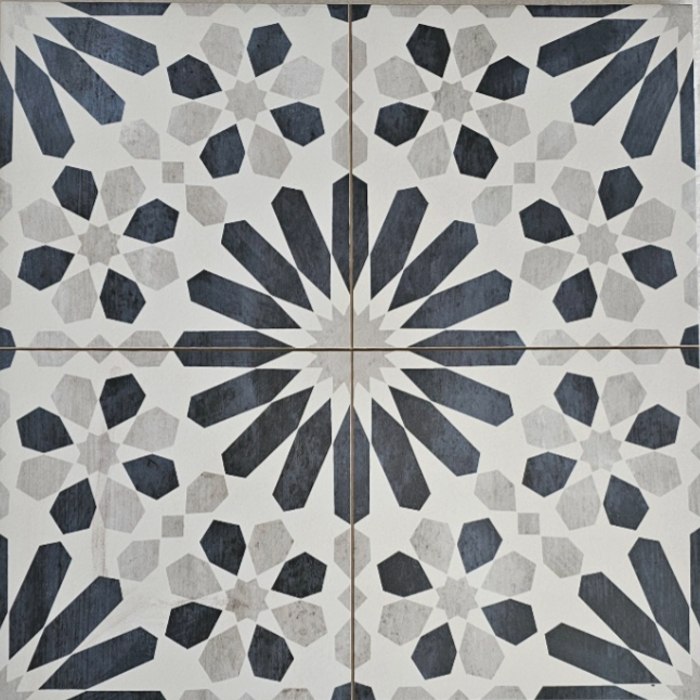 El patrón es geométrico y floral, con una combinación de tonos grises, negros y blancos, creando un contraste visual atractivo y sofisticado. En el centro de cada losa, destaca una figura en forma de estrella o flor, formada por pétalos o triángulos que se expanden hacia los bordes.