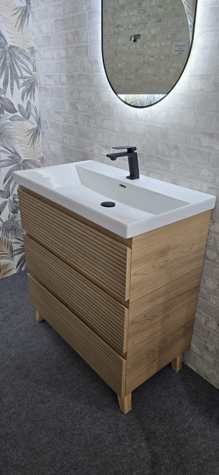 Presenta un diseño moderno y elegante, ideal para un espacio contemporáneo. Está compuesto por una base de madera clara con un acabado natural que resalta su textura y líneas. La parte inferior tiene tres cajones con un patrón lineal en relieve, ofreciendo un toque sofisticado y a la vez funcional para almacenar productos de baño.